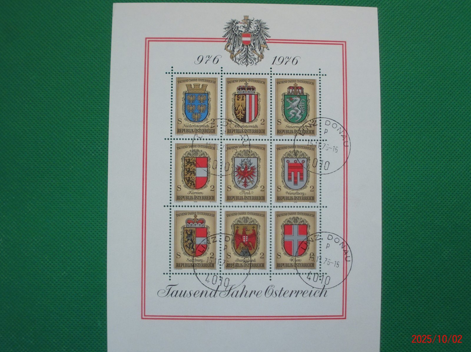 Blockausgabe Nr. 4 1000 Jahre Österreich – Wappen der Bundesländer gestempelt Linz Donau 15.11.1976, ungelaufen