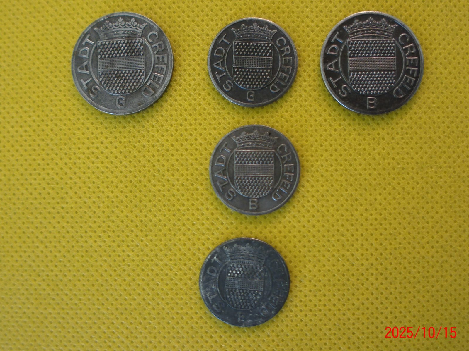 Kriegsersatzgeld der Stadt Crefeld 1 x 10 Pfennig 1918 B    1 x 10 Pfennig 1919 G 1 x  5 Pfennig  1918 B    1 x   5 Pfennig 1919 G   1 x 5 Pfennig 1919 E Erhaltungszustand  von S bis SS